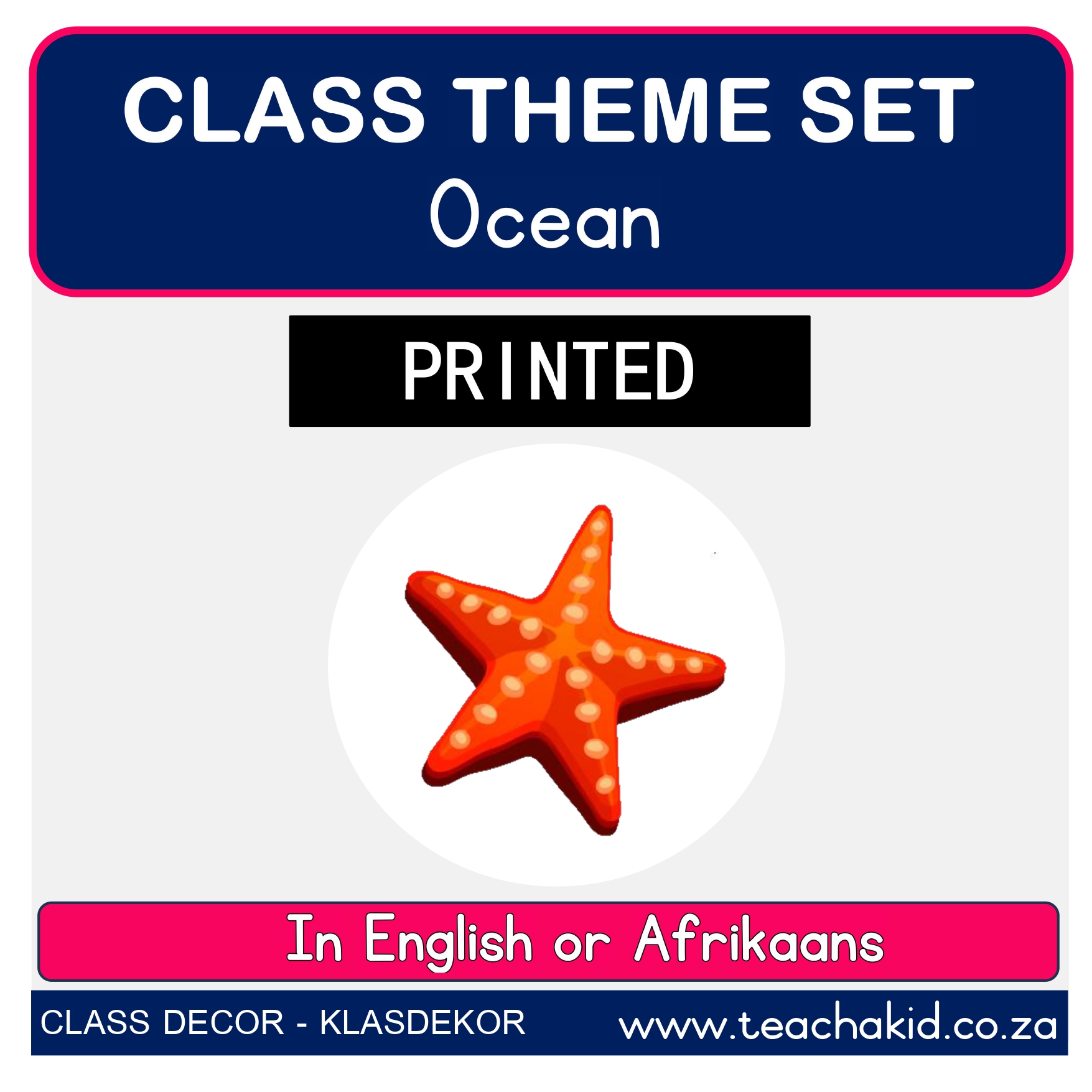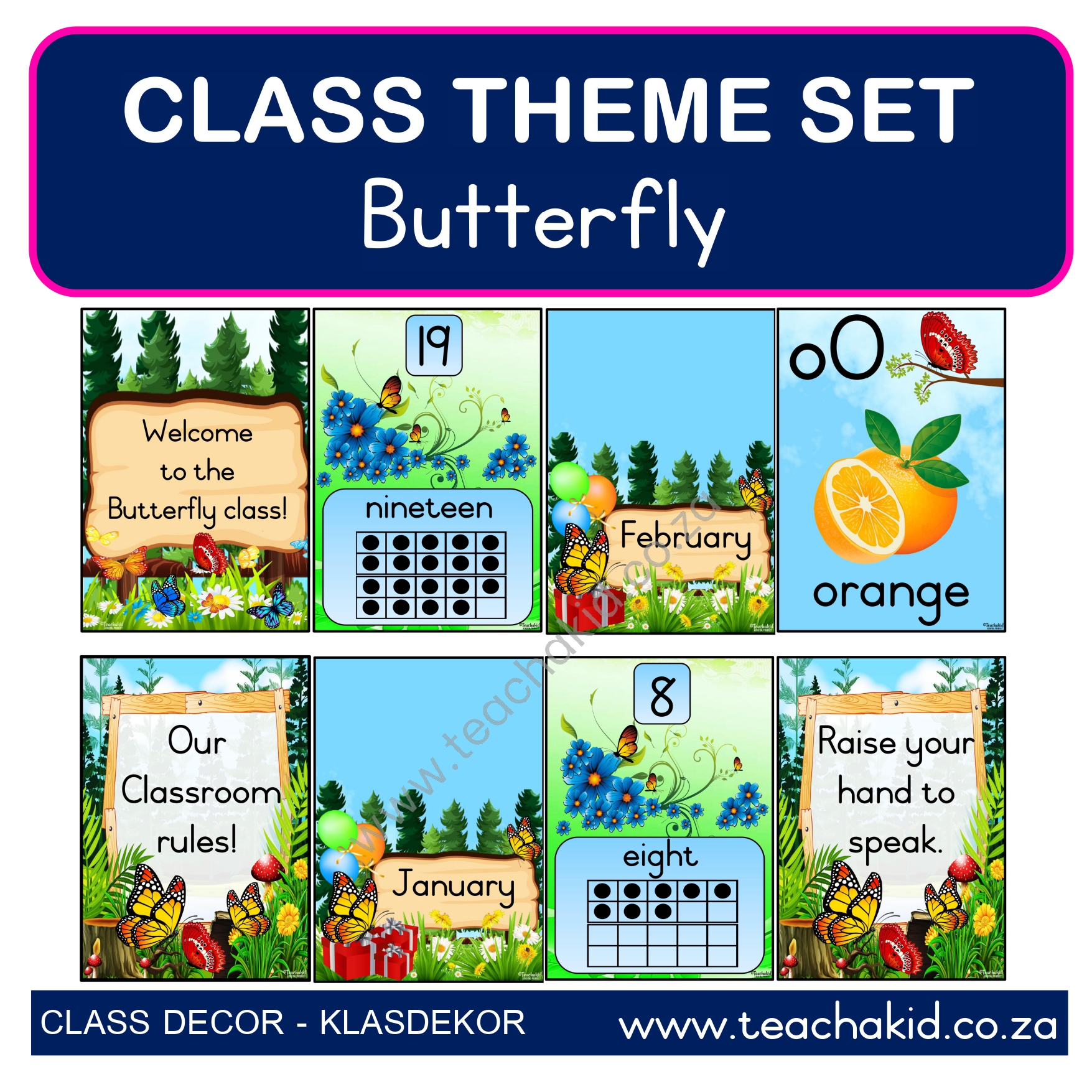 A printed and laminated Butterfly class theme set. Available in the following Language options: English | Afrikaans. Suitable for Foundation Phase classrooms, ECD centres and Preschools.
