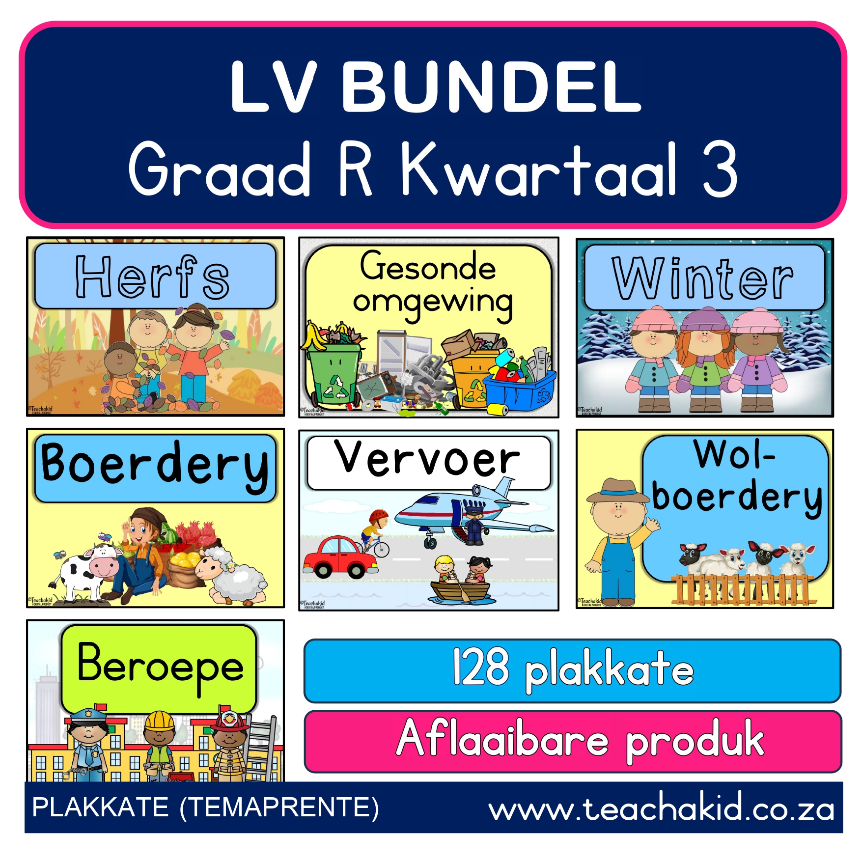 Three hundred and ten (310) A4 posters in Afrikaans. Themes included in this bundle are My liggaam en gesonde leefwyses, My Sintuie, Vorms, Kleure, Somer, My gesin, Veiligheid in die huis, Weer, Winter, Herfs, Boerdery, Gesonde omgewing, Beroepe, Vervoer, Lente, Sport, Voëls, Dinosourusse en Reptiele.
