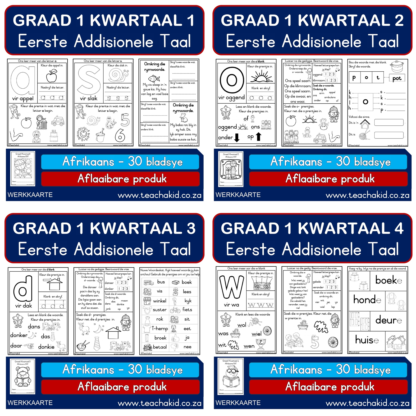 A mega bundle of Additional Language worksheets perfect to work ahead or to use for revision all year round, compiled according to CAPS Grade 1.  Our year package covers all the required areas, offered in four different books – one per term. This package is available in English First Additional Language or Afrikaans First Additional Language.
