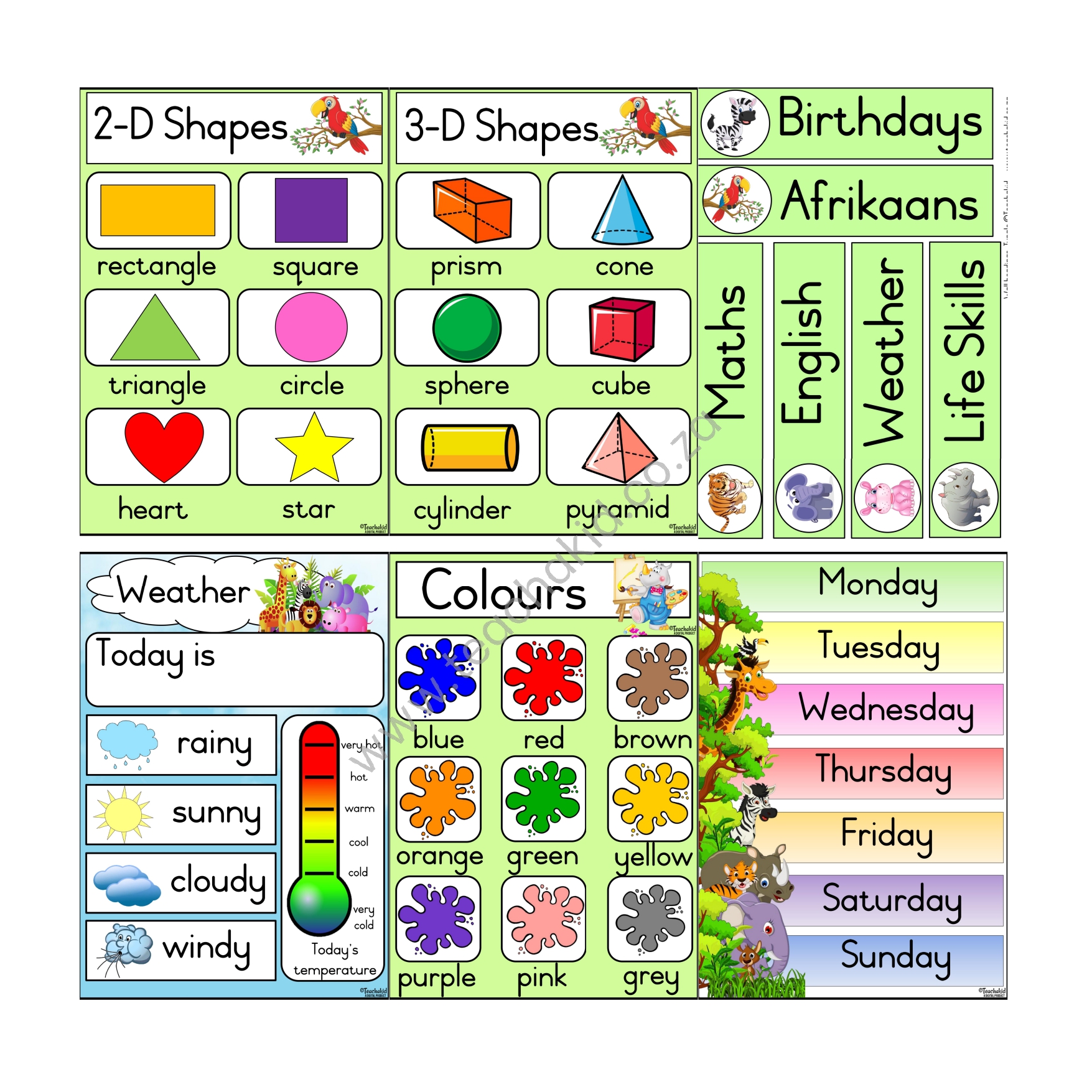 A digital Jungle class theme set in PDF for self-print. Available in the following Language options: English | Afrikaans. Suitable for Foundation Phase classrooms, ECD centres and Preschools.