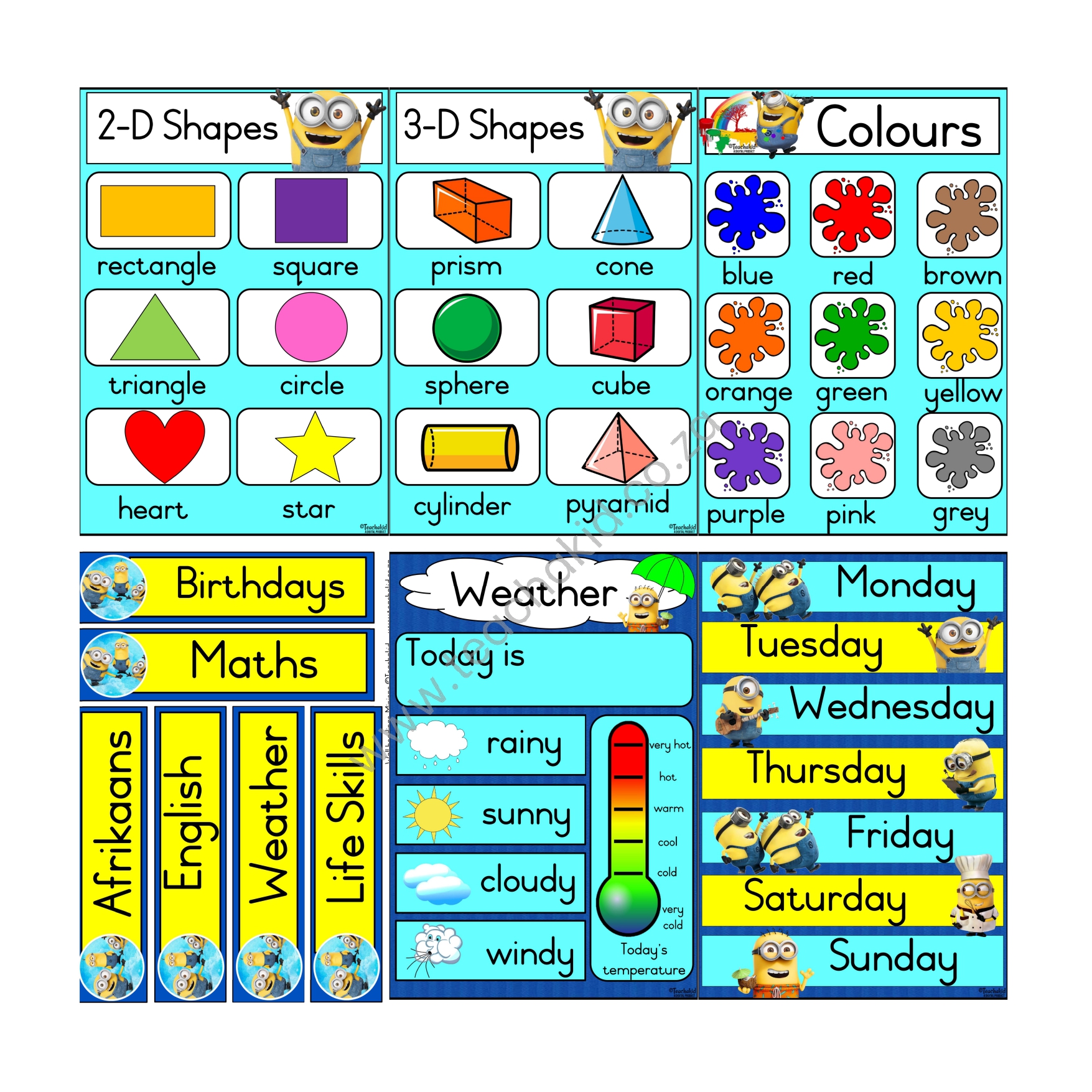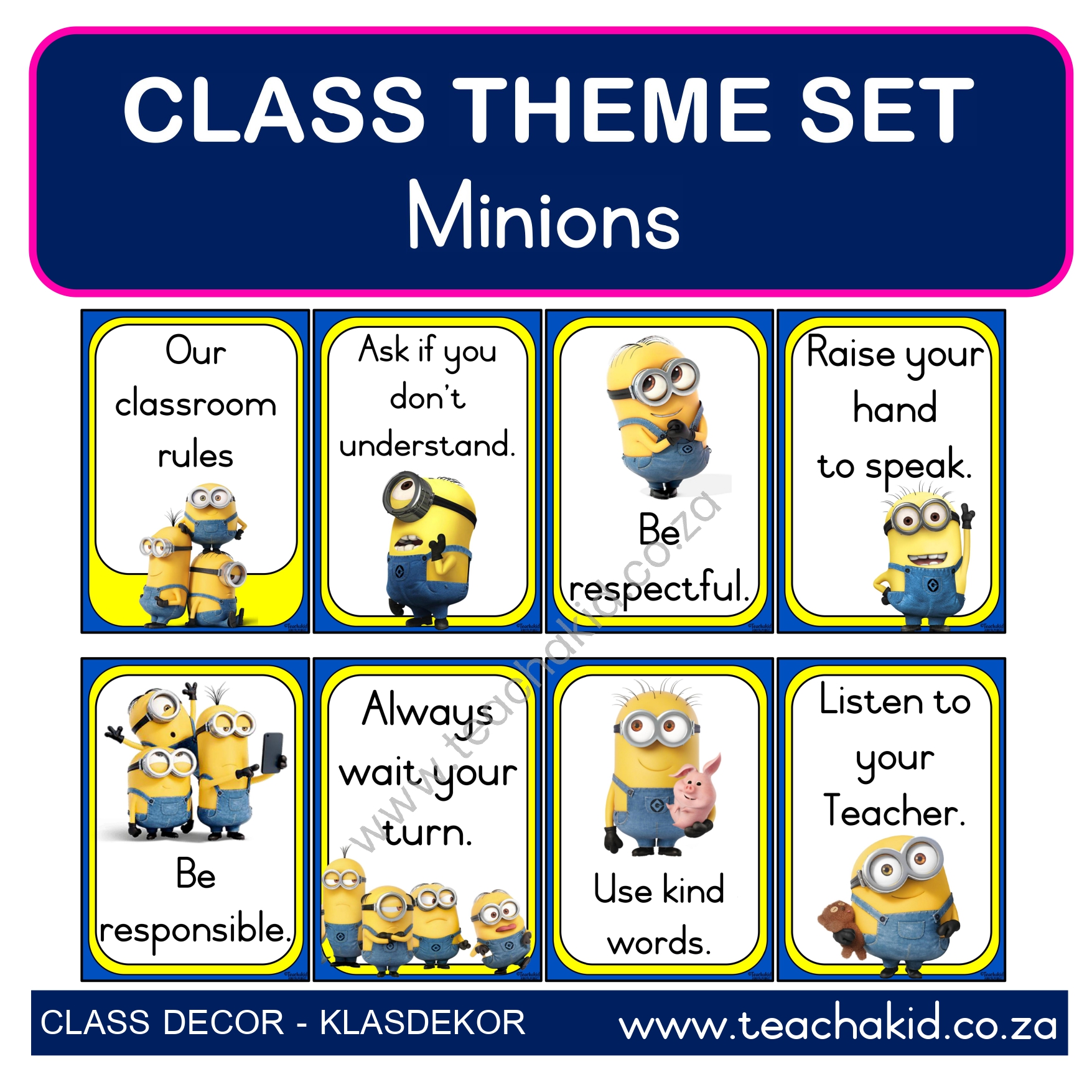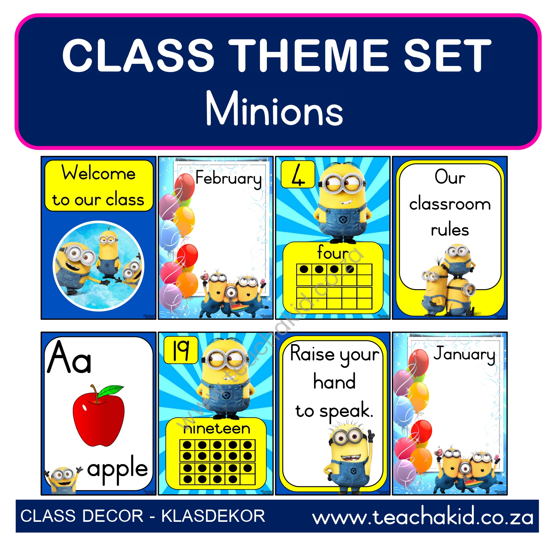 A printed and laminated Minions class theme set. Available in the following Language options: English | Afrikaans. Suitable for Foundation Phase classrooms, ECD centres and Preschools.