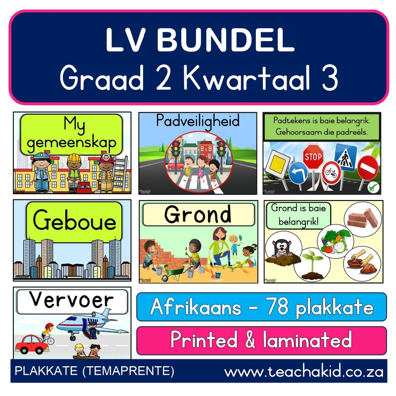 A bundle of two hundred and ninety-seven (297) Life Skills posters in Afrikaans covering various themes for the year. This bundle is suitable for Grade 2 learners, compiled according to CAPS Term 1 to 4. Each poster is printed on A4 board, laminated and trimmed.