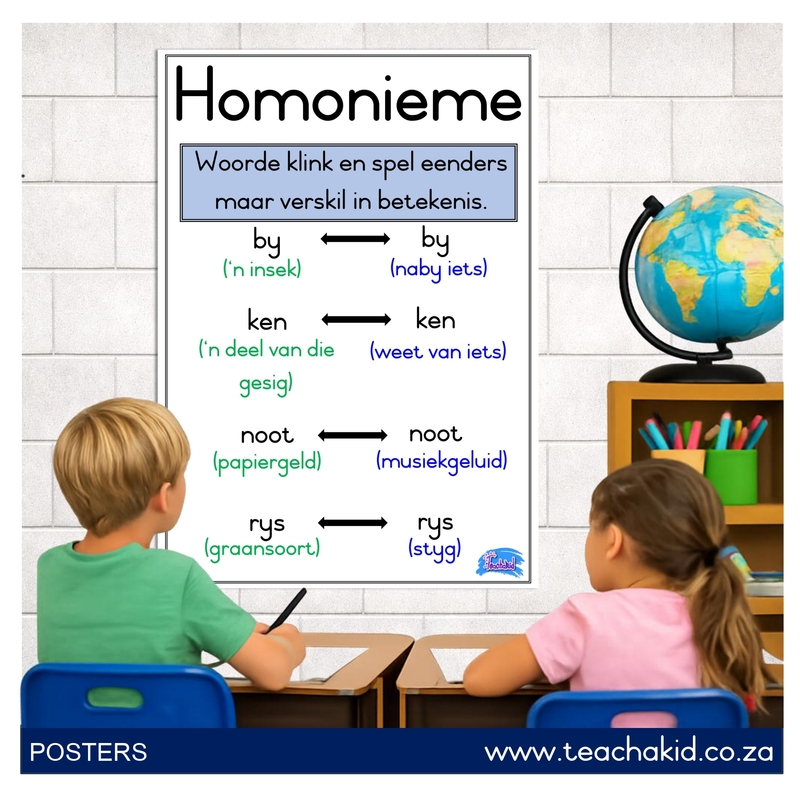 Previous Product Next Product Plakkaat: Homofone (printed)R28,00An A3 Afrikaans poster showcasing homophones, printed on board and laminated for lasting durability. Plakkaat: Homofone (printed) quantity Add to basketRelated products AfrikaansPlakkaat: Versamelname (printed) R28,00Add to basket AfrikaansPlakkaat: Ontkenning (printed) R28,00Add to basket AfrikaansPlakkaat: Selfstandige naamwoorde (printed) R28,00Add to basket