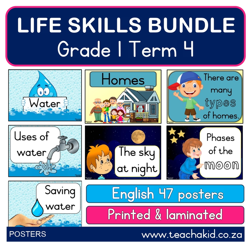 A bundle of seventy-six (76) Life Skills posters in English covering various themes. This bundle is suitable for Grade R learners, compiled according to CAPS Term 4. Each poster is printed on A4 board, laminated and trimmed.
