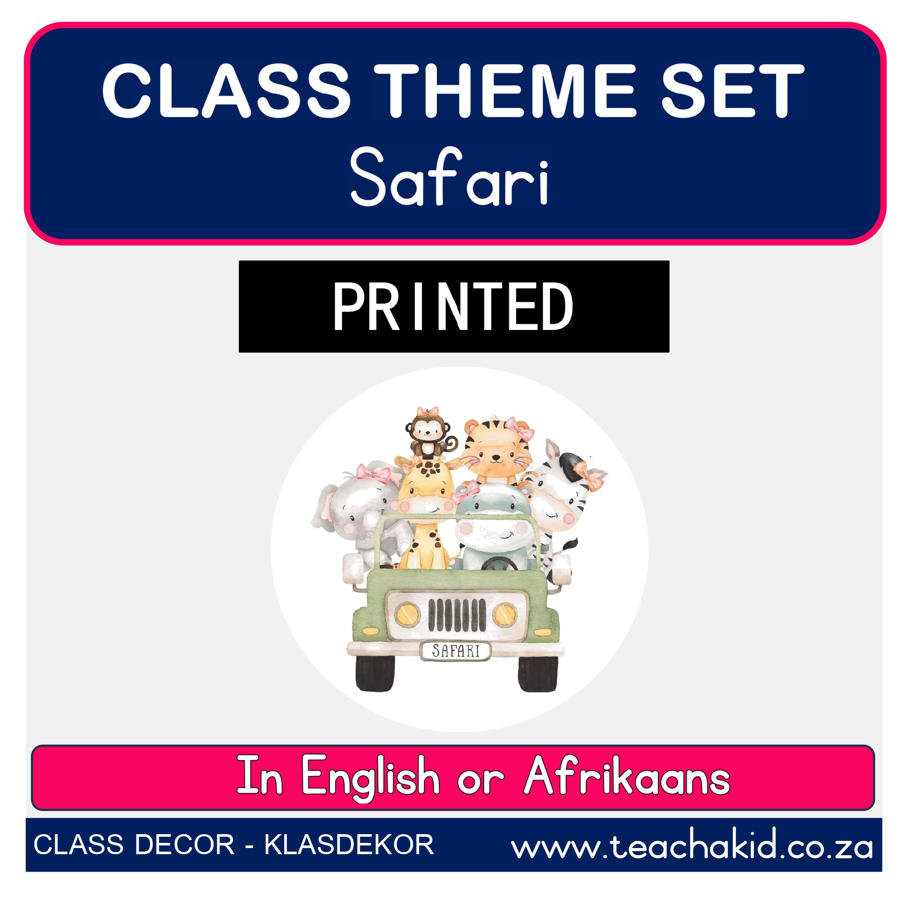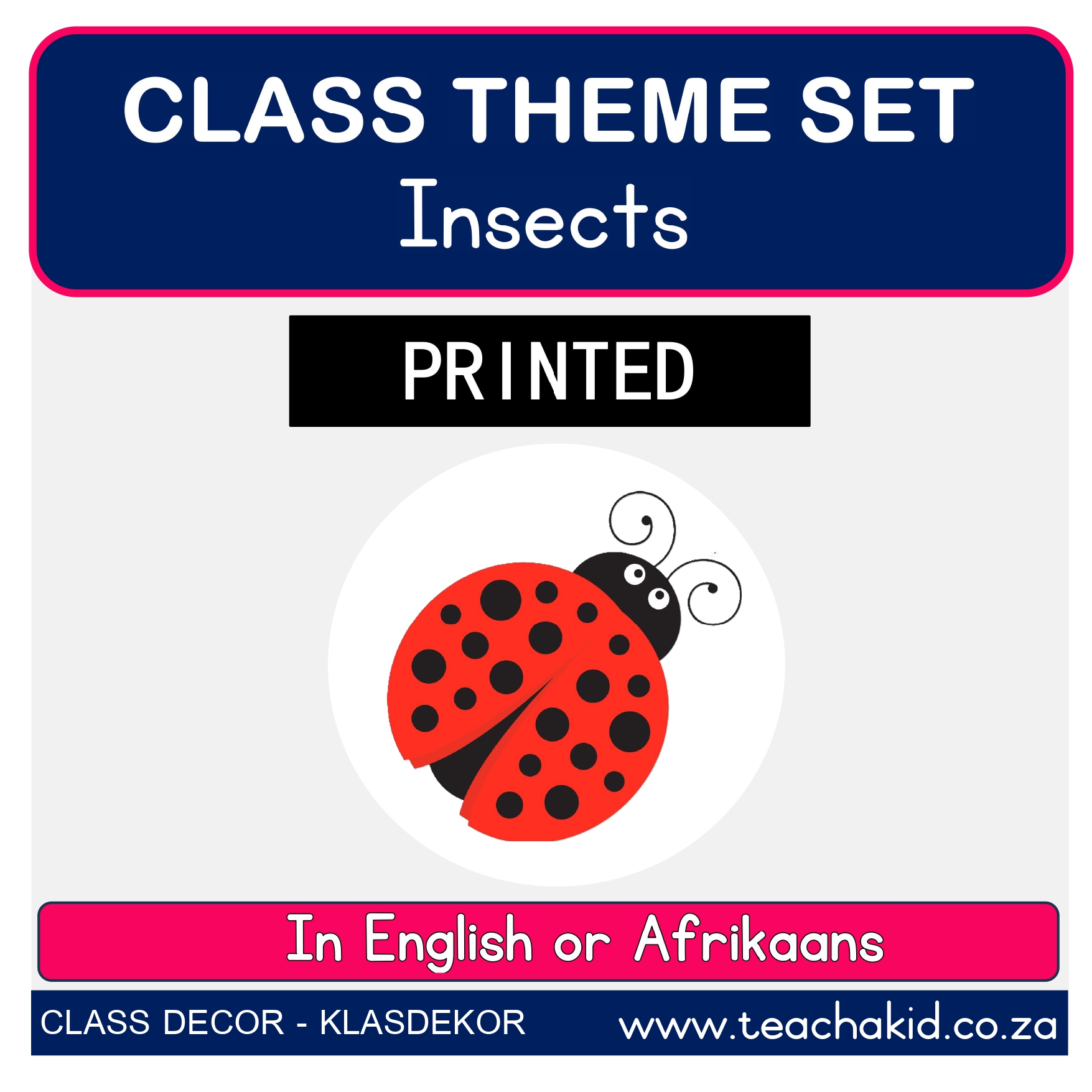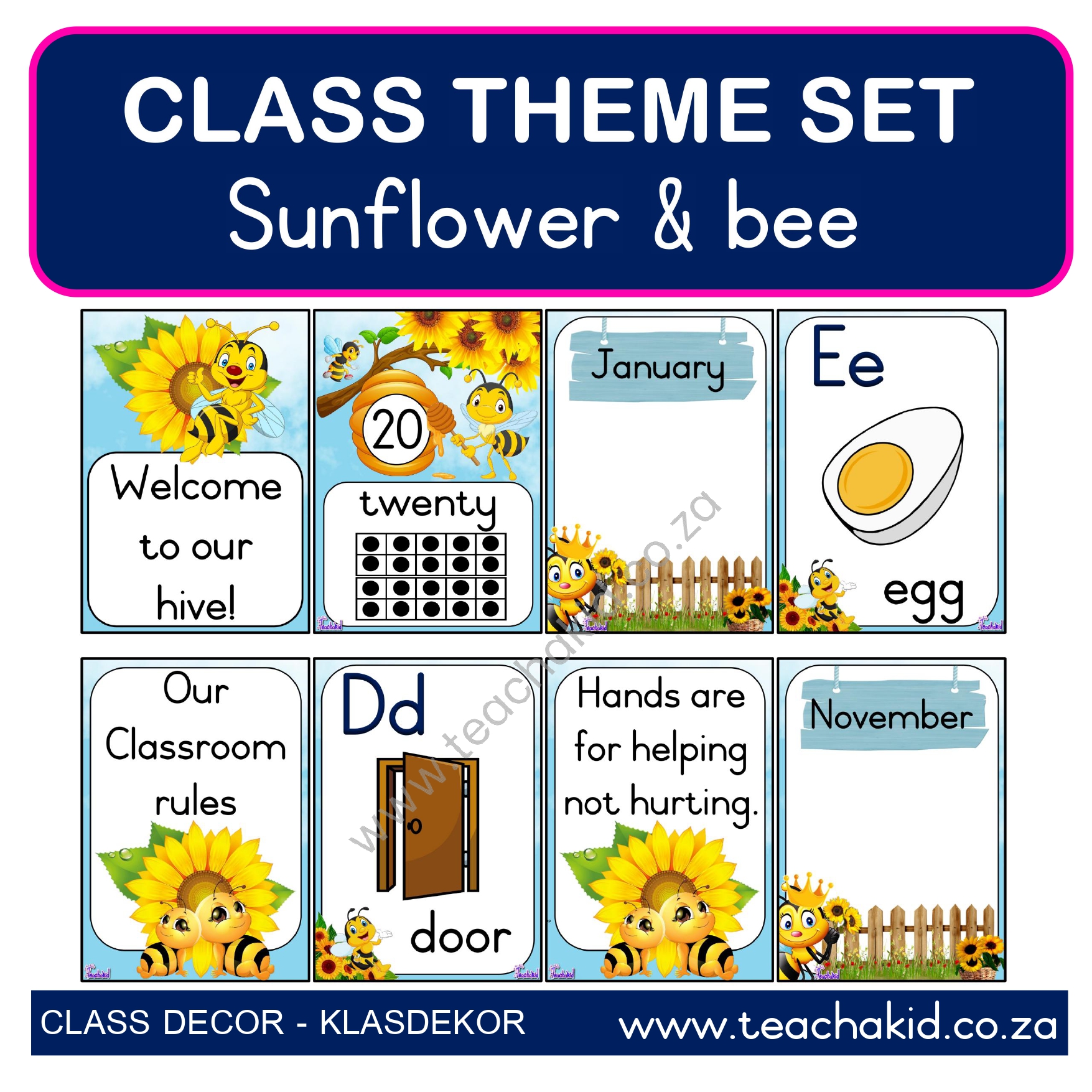 A printed and laminated Sunflower and Bee class theme set. Available in the following Language options: English | Afrikaans. Suitable for Foundation Phase classrooms, ECD centres and Preschools.