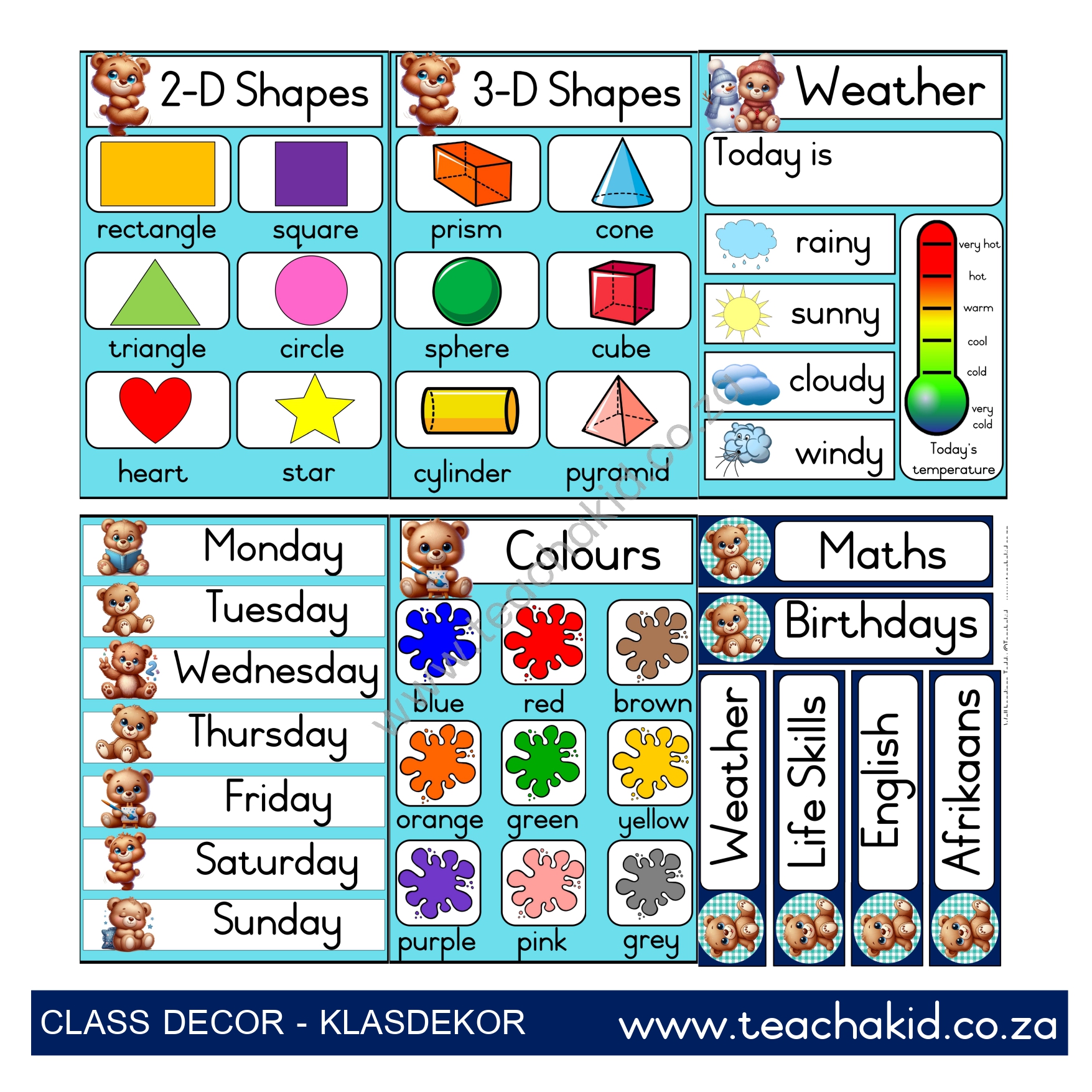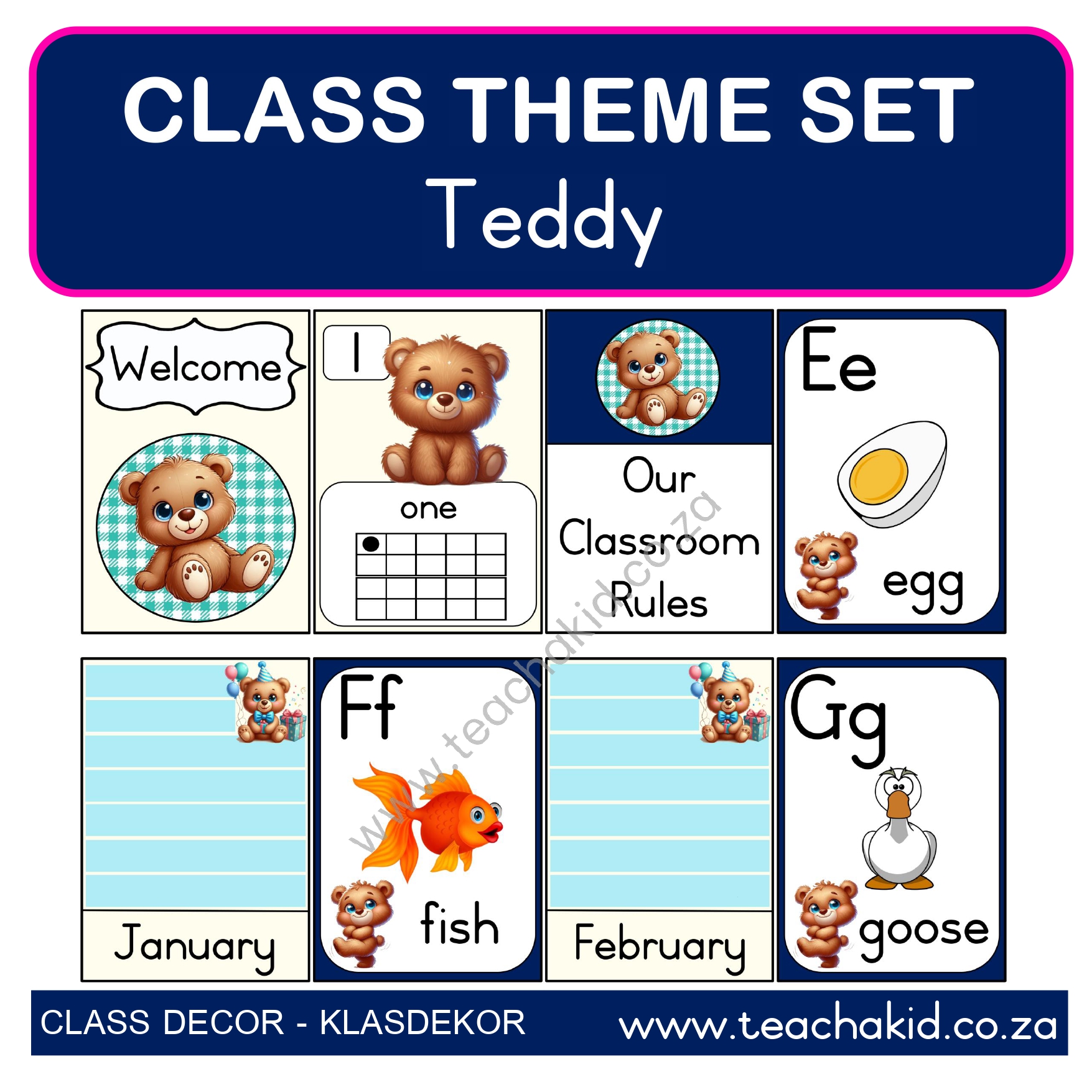 A printed and laminated Teddy class theme set. Available in the following Language options: English | Afrikaans. Suitable for Foundation Phase classrooms, ECD centres and Preschools.