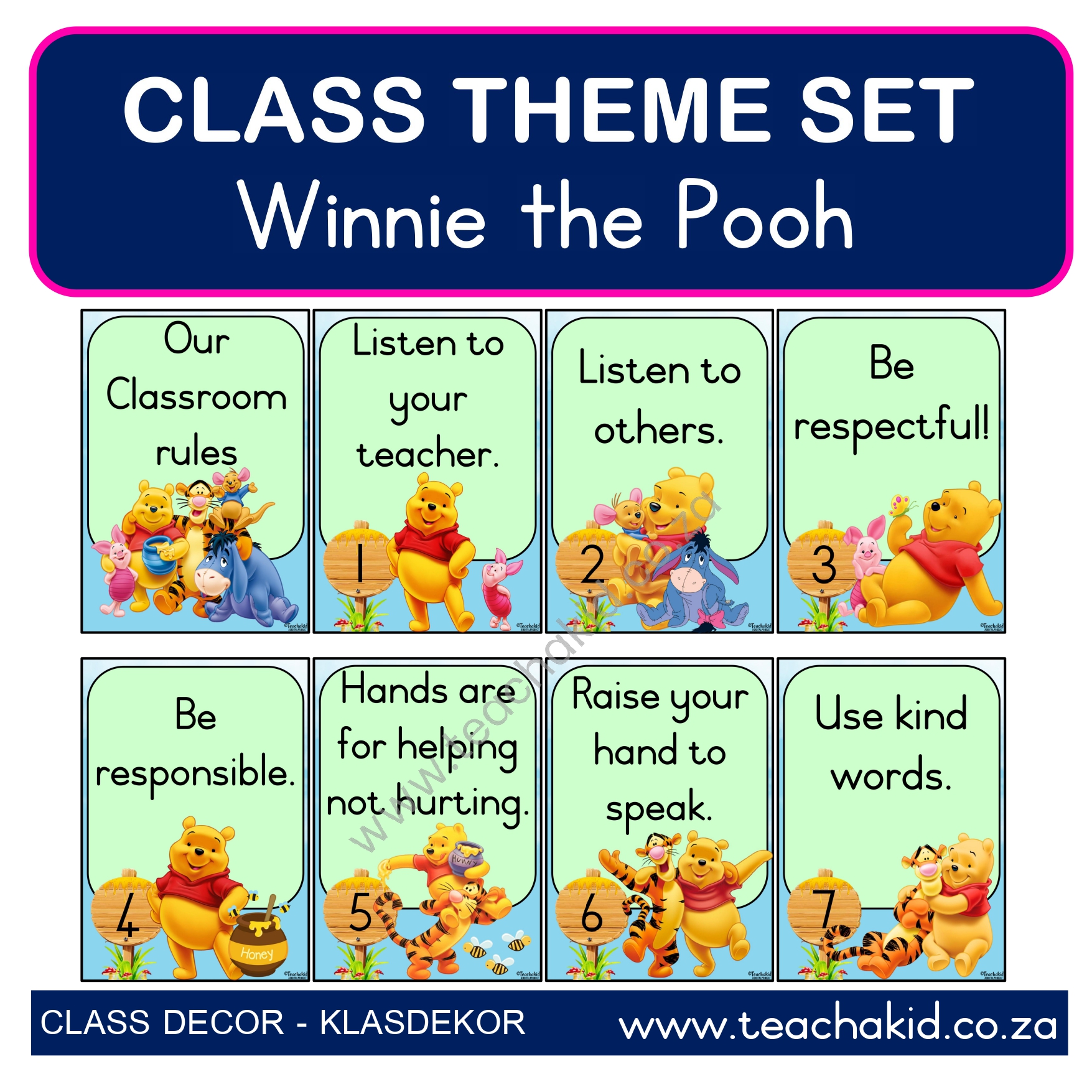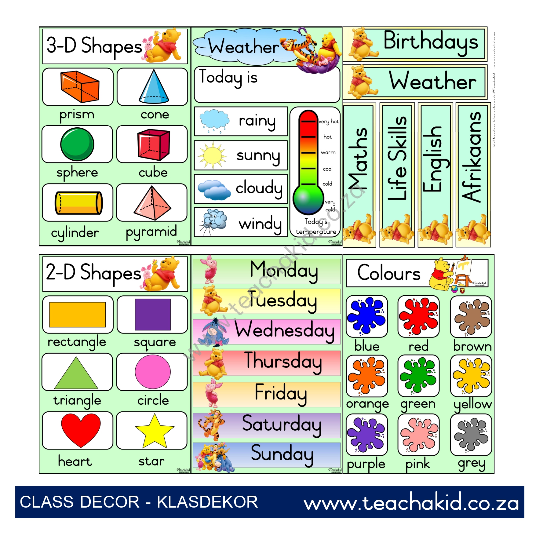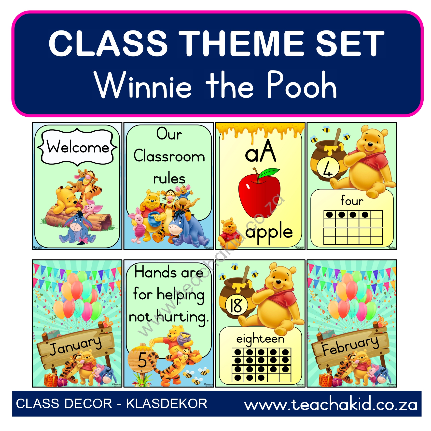 A digital Winnie the Pooh class theme set in PDF for self-print. Available in the following Language options: English | Afrikaans. Suitable for Foundation Phase classrooms, ECD centres and Preschools.
